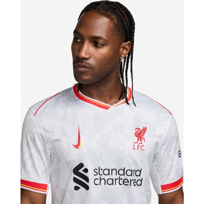White Jersey with LFC Liverbird badge, LFC sponsors and a unique upward dual Nike swoosh.